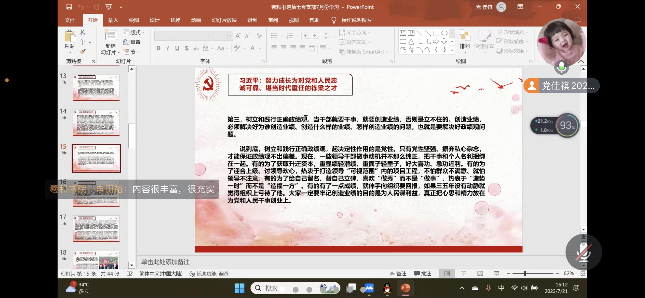 7 月 21 日,羲和书院学生第七党支部通过腾讯会议开展“学习党章、遵守党章”专题党课学习活动,支部书记申田裕领学,全体支部成员参加。