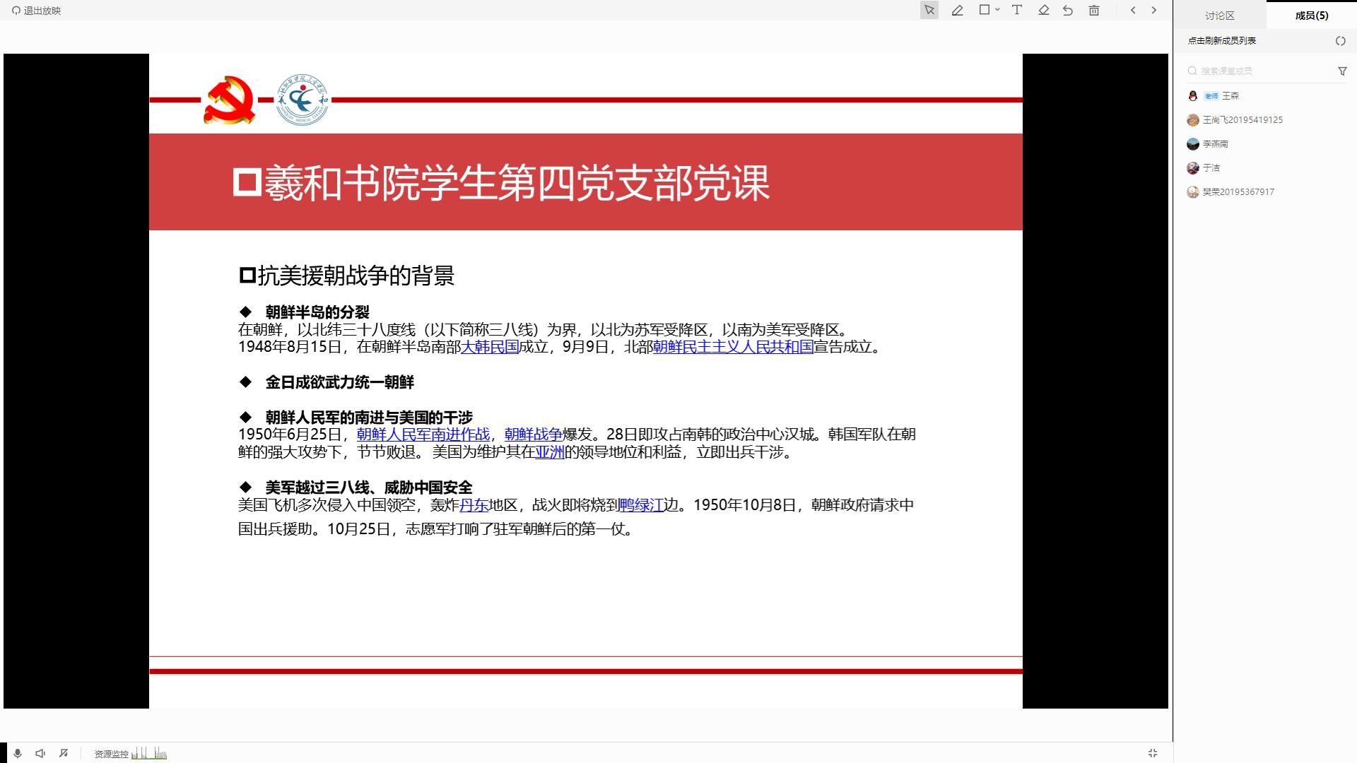 10月19日,羲和书院学生第四党支部通过腾讯课堂平台开展“学习抗美援朝战争的历史”专题党课活动。会议由党支部书记王森主持,全体党员参会。