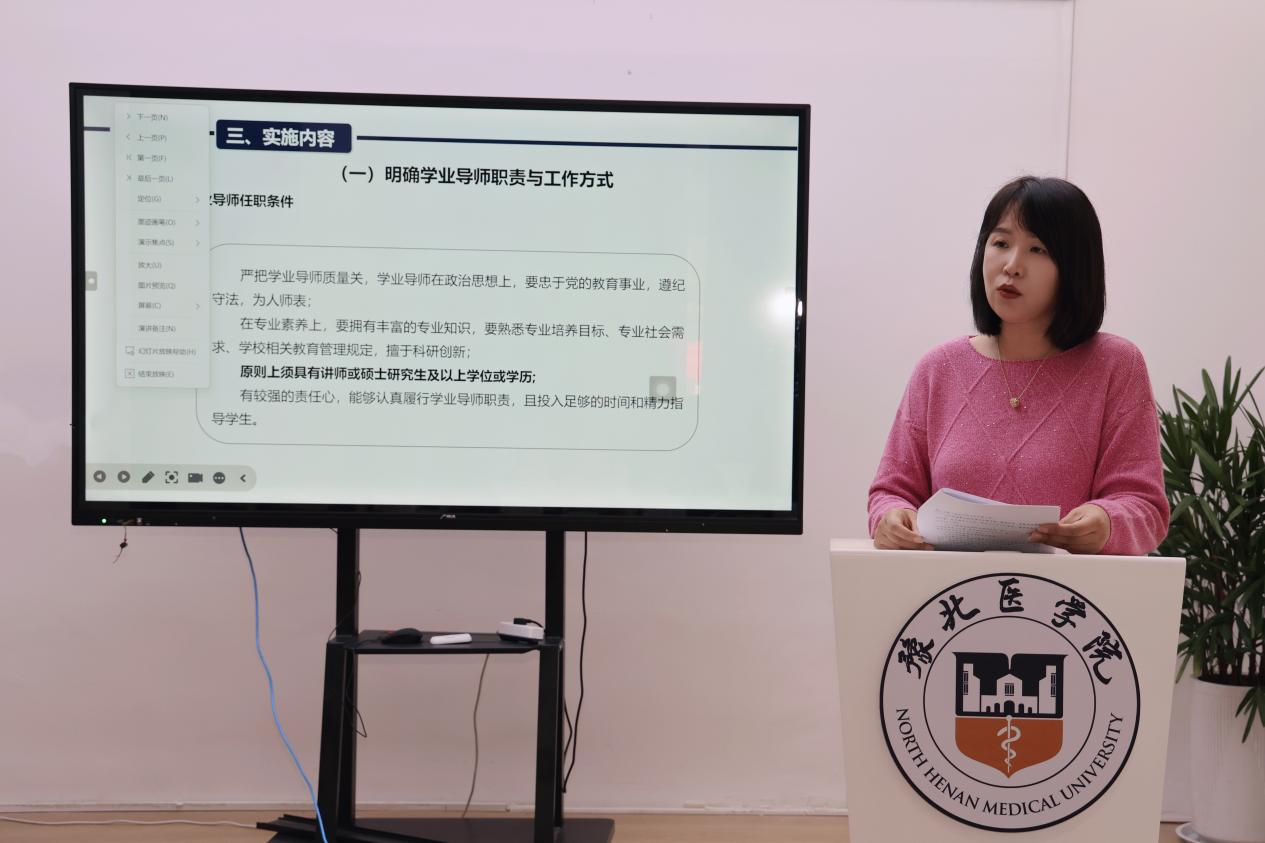 在文件领学环节,羲和书院党委副书记唐玉玲带领全体与会人员共同学习了《豫北医学院关于进一步加强学业导师工作的实施意见》。她强调,学业导师应严格遵循文件要求,结合工作实际,积极建言献策,共同推进学业指导工作提质增效。