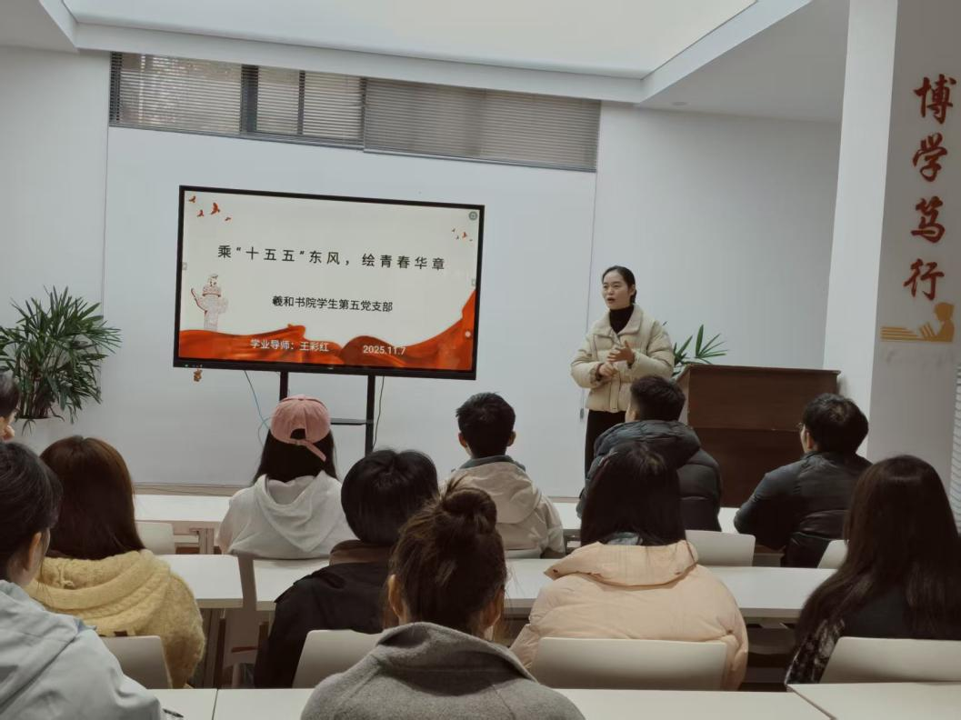 2025年11月7日下午,羲和书院学生第五党支部开展以“乘‘十五五’东风,绘青春华章”为主题的专题指导活动。本次活动旨在深入领会二十届四中全会通过的《中共中央关于制定国民经济和社会发展第十五个五年规划的建议》核心要义,推动青年学生将个人成长融入国家发展大局。