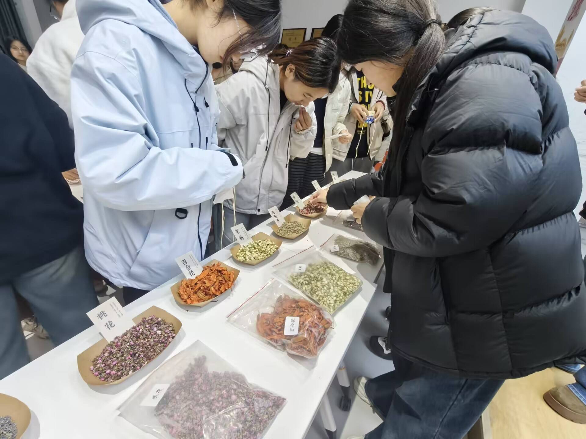 当归的醇厚、黄芪的温润、薄荷的清冽交织弥漫,勾勒出传统医药与现代校园交融的独特景致。活动以《中药学》课程核心知识为锚点,深度溯源《本草纲目》古方精髓,筛选适配药材并打造沉浸式药材知识展架,让同学们在动手实践前,完成了一场从理论到具象的专业知识复盘。辨识药材性味、梳理配伍逻辑、精准称量分装,专业严谨与传统香包制作的巧思雅致在此碰撞交融。