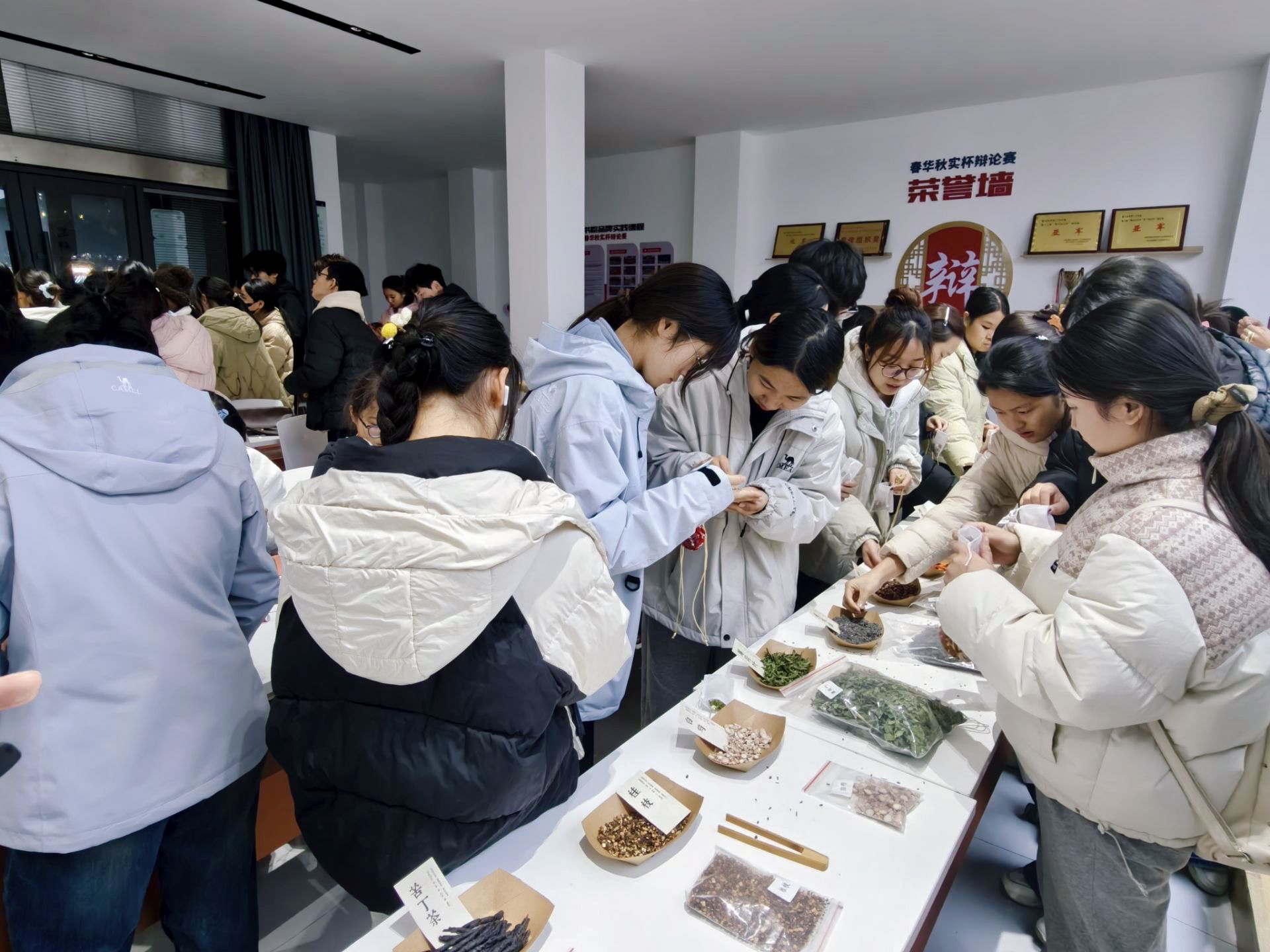 当归的醇厚、黄芪的温润、薄荷的清冽交织弥漫,勾勒出传统医药与现代校园交融的独特景致。活动以《中药学》课程核心知识为锚点,深度溯源《本草纲目》古方精髓,筛选适配药材并打造沉浸式药材知识展架,让同学们在动手实践前,完成了一场从理论到具象的专业知识复盘。辨识药材性味、梳理配伍逻辑、精准称量分装,专业严谨与传统香包制作的巧思雅致在此碰撞交融。