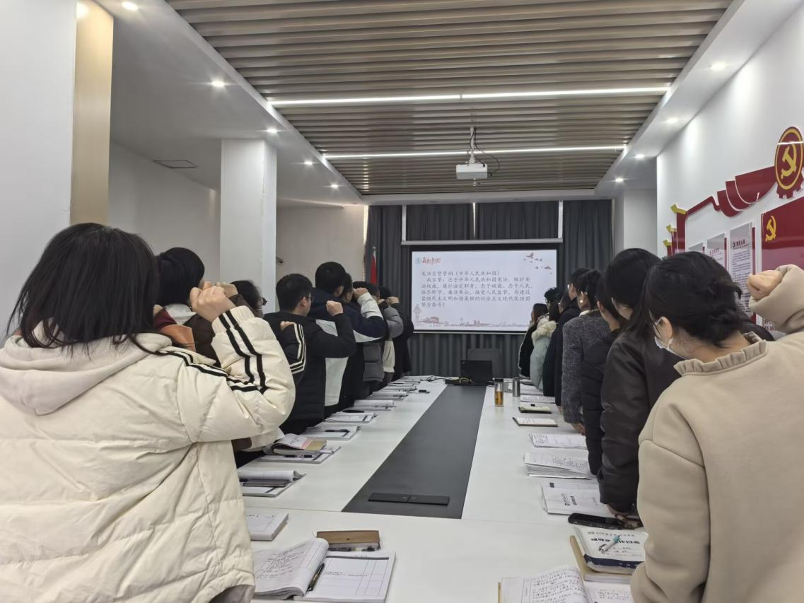 “红旗长扬,我们迎着朝阳,成长路上,聆听宪法雄壮的声响……”悠扬的旋律在书院响起。师生们广泛传唱《宪法伴我们成长》主题歌曲,在歌声中体悟宪法守护美好生活的温暖力量。活动高潮,全体师生肃然立正,举起右拳,庄严进行宪法宣誓。誓言铮铮,表达了书院人忠于宪法、维护宪法权威的坚定决心,许下了弘扬法治精神、践行时代使命的郑重承诺。