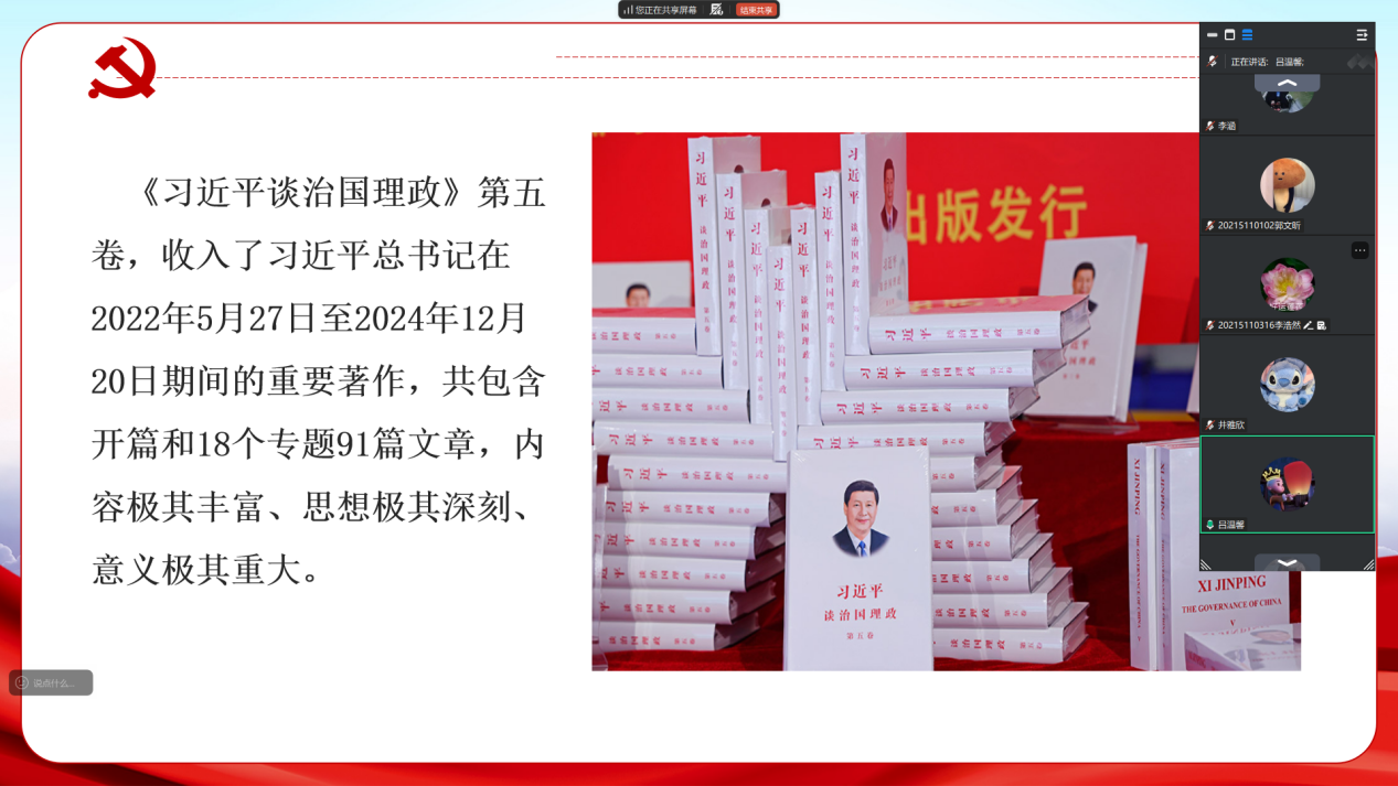 支部组织委员吕温馨同志带领大家学习了《习近平谈治国理政》第五卷部分章节,重点围绕“把握新发展阶段,贯彻新发展理念,构建新发展格局”展开讲解,强调要坚持用党的创新理论武装头脑、指导实践。