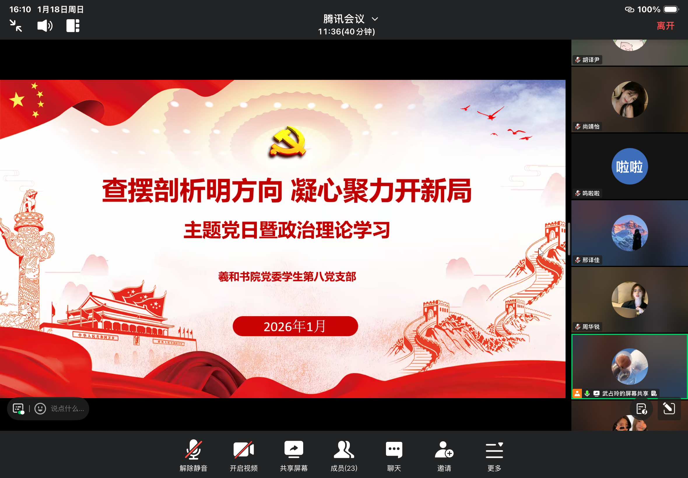 1月19日,羲和书院学生第八党支部在腾讯会议召开“查摆剖析明方向,凝心聚力开新局”主题党日暨政治理论学习活动,会议由支部书记武占玲主持,支部全体党员、入党积极分子及学生代表参加。