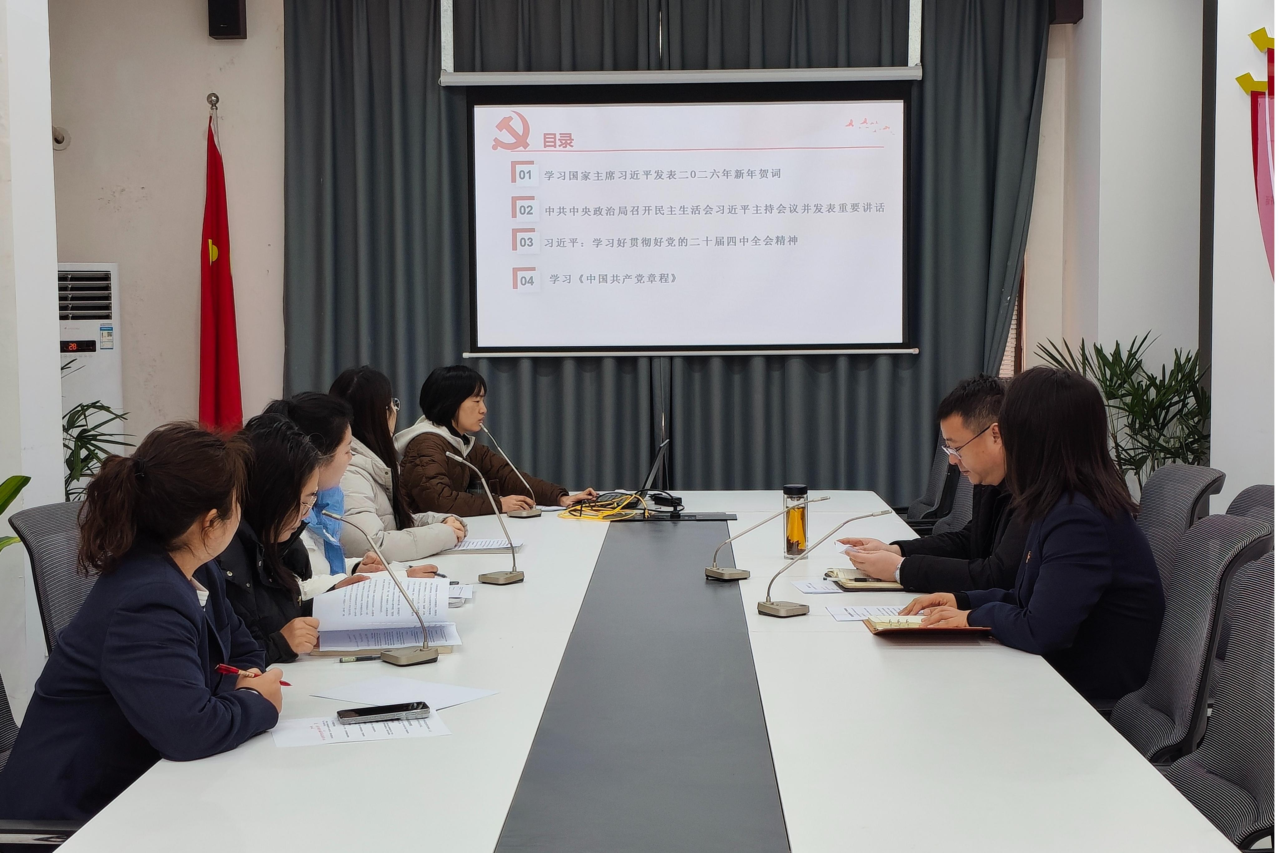 会议严格落实“第一议题”制度,聚焦一月份政治理论学习重点内容,有序开展集中学习研讨。张新首先领学了国家主席习近平发表的二〇二六年新年贺词,深入解读了贺词中蕴含的家国情怀与使命担当,带领与会人员深刻感悟过去一年国家发展的辉煌成就和新一年的奋斗方向,引导全体教职工将个人工作融入国家发展大局。随后,武占玲领学了中共中央政治局民主生活会相关精神,重点传达了习近平总书记在民主生活会上的重要讲话要求。接着,刘畅带领全体人员专题学习习近平总书记关于学习好贯彻好党的二十届四中全会精神的重要论述,结合全会公报核心内容,深入解读了“十五五”时期在基本实现社会主义现代化进程中的承前启后重要地位。