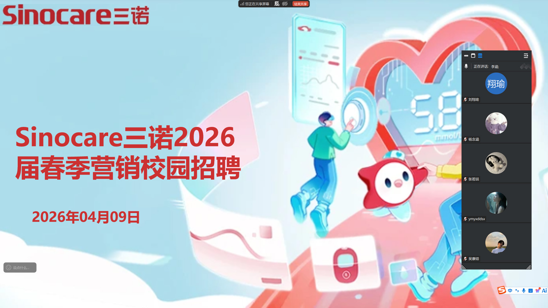4月9日,第二场招聘会通过腾讯会议平台线上开展。三诺生物传感股份有限公司招聘负责人就公司生物传感技术优势、慢病管理产品体系及2026届校园招聘计划进行介绍,并开放线上问答与简历接收通道。